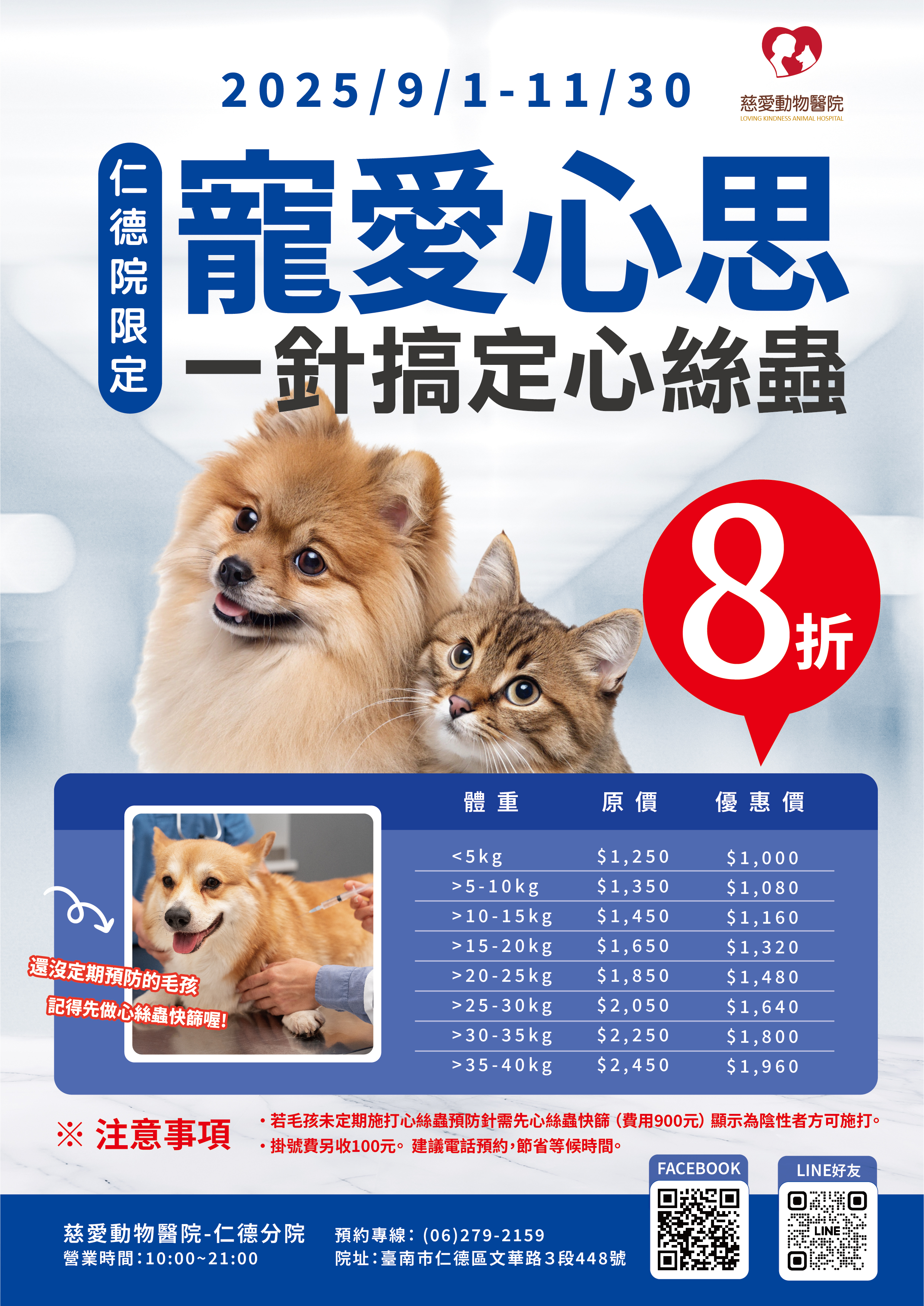 為守護毛孩健康,慈愛動物醫院仁德分院推出限時優惠!凡於活動期間內到院施打心絲蟲預防針,即可享 8折優惠,一針搞定,守護全年!