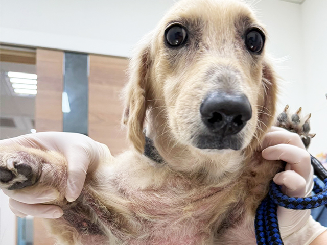 長期的異位性皮膚炎讓花生不斷舔咬、抓癢,甚至因耳朵搔癢引發血腫,身體的不適也造成牠精神不佳、活動力下降,讓家人陷入「想抱又不敢靠近」的矛盾,直到接受外泌體療程搭配專業洗劑護理才有所好轉。起初飼主還半信半疑,但回診時感到明顯改善,「牠的皮屑真的比之前少很多」,6月中時病情趨於穩定,就連皮膚紅腫也有所緩解,摸狗狗時也不再滿手油膩。