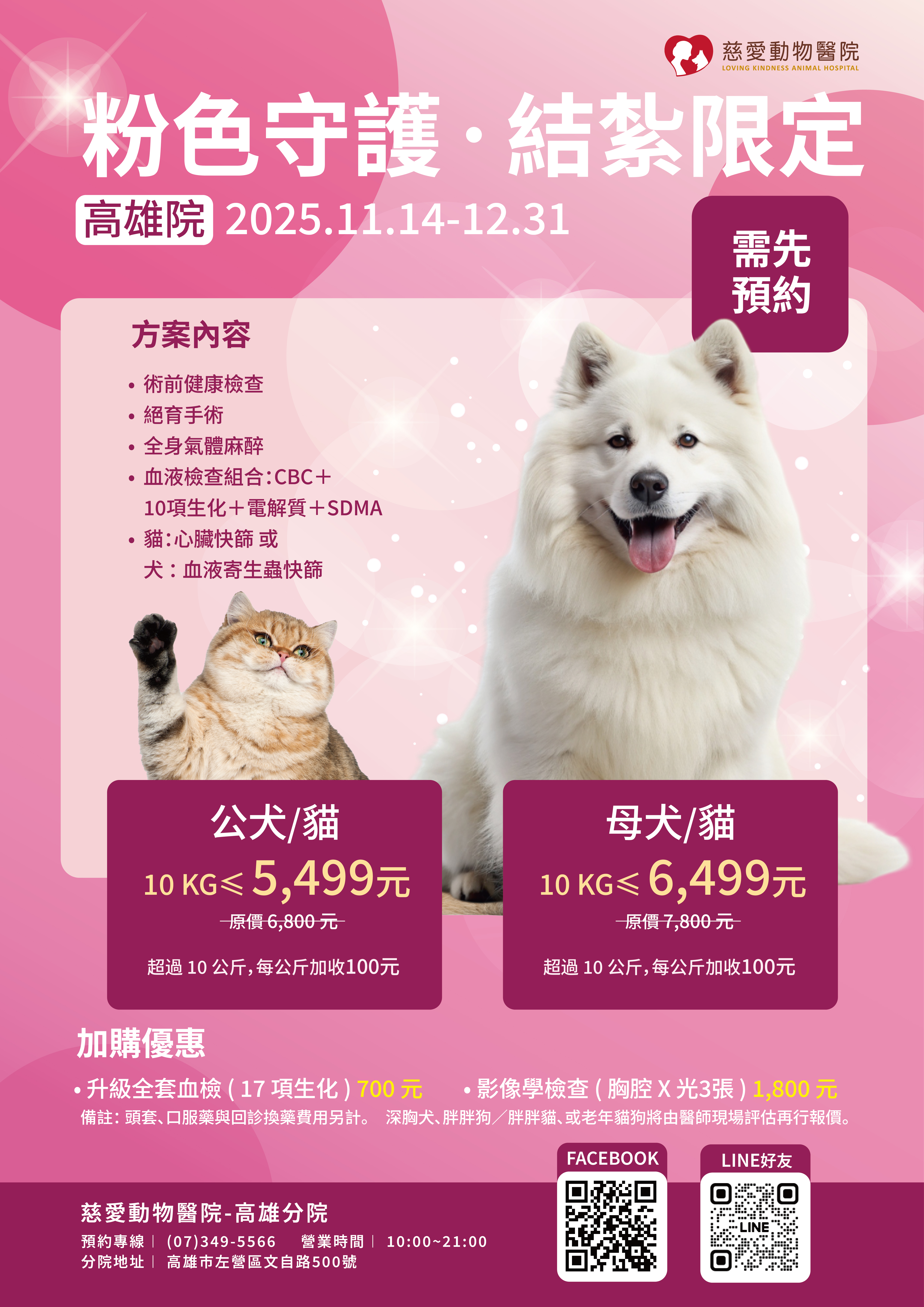 活動院所慈愛動物醫院-高雄分院(高雄市左營區文自路500號)預約專線:(07)349-5566 營業時間:10:00–21:00