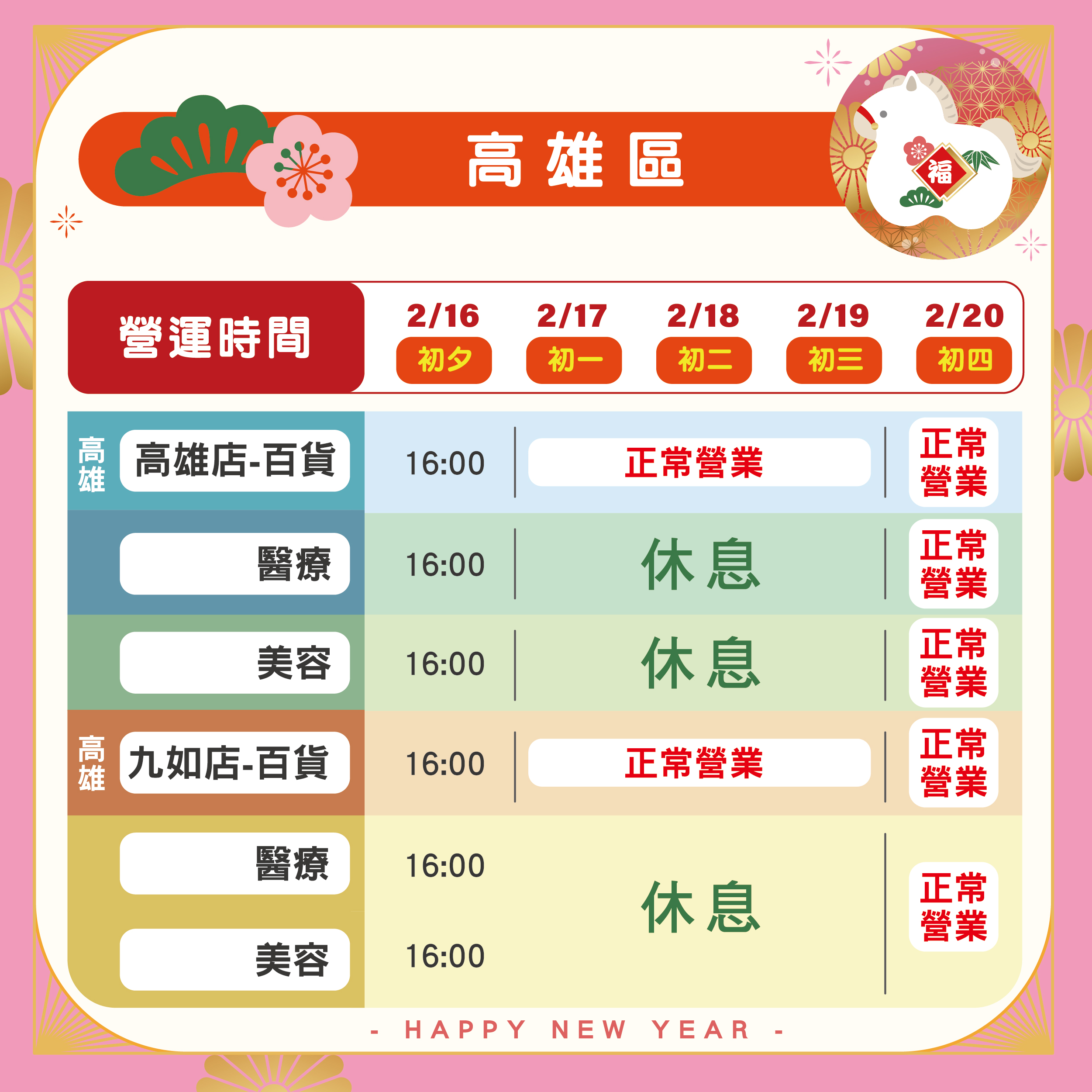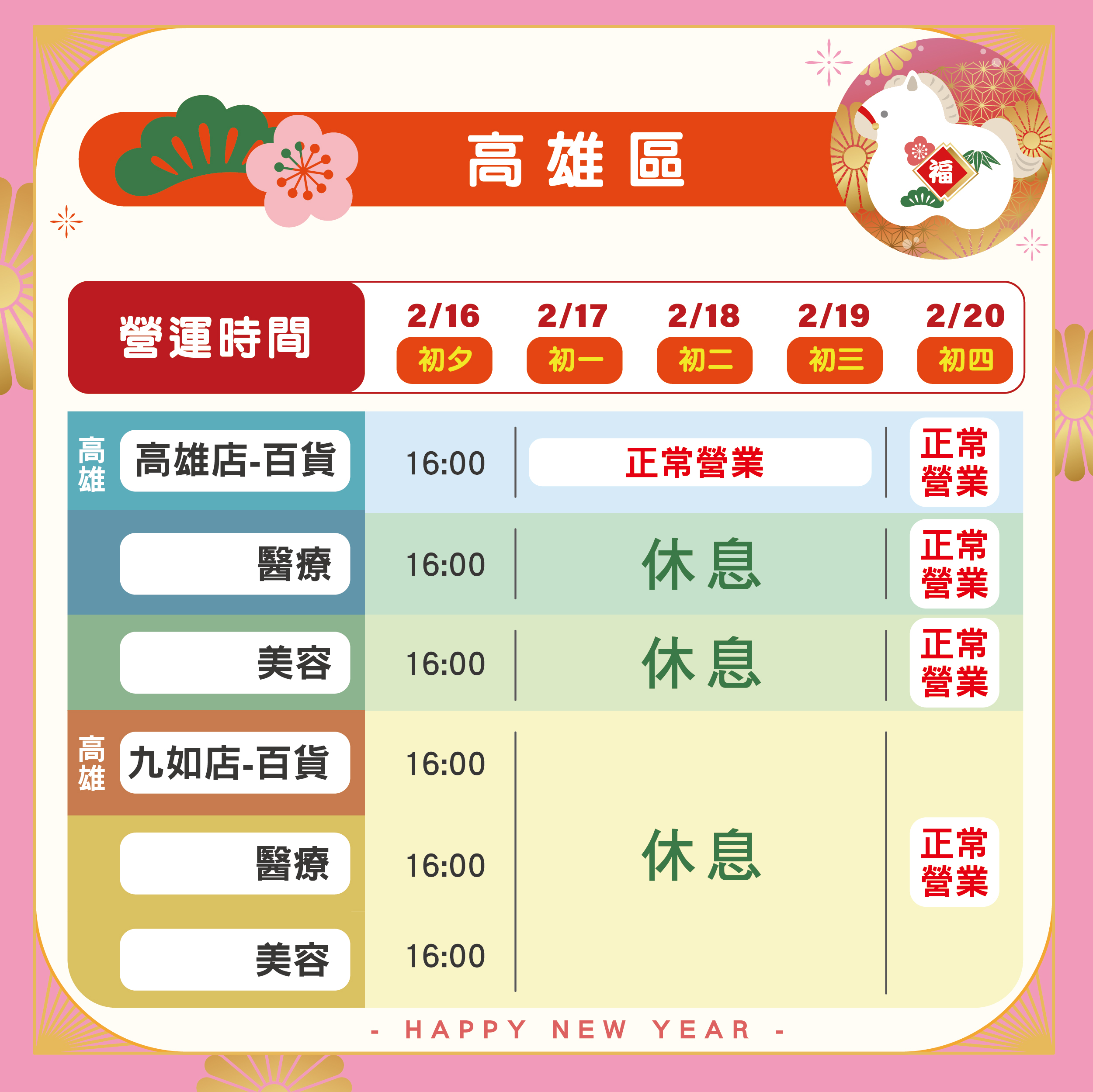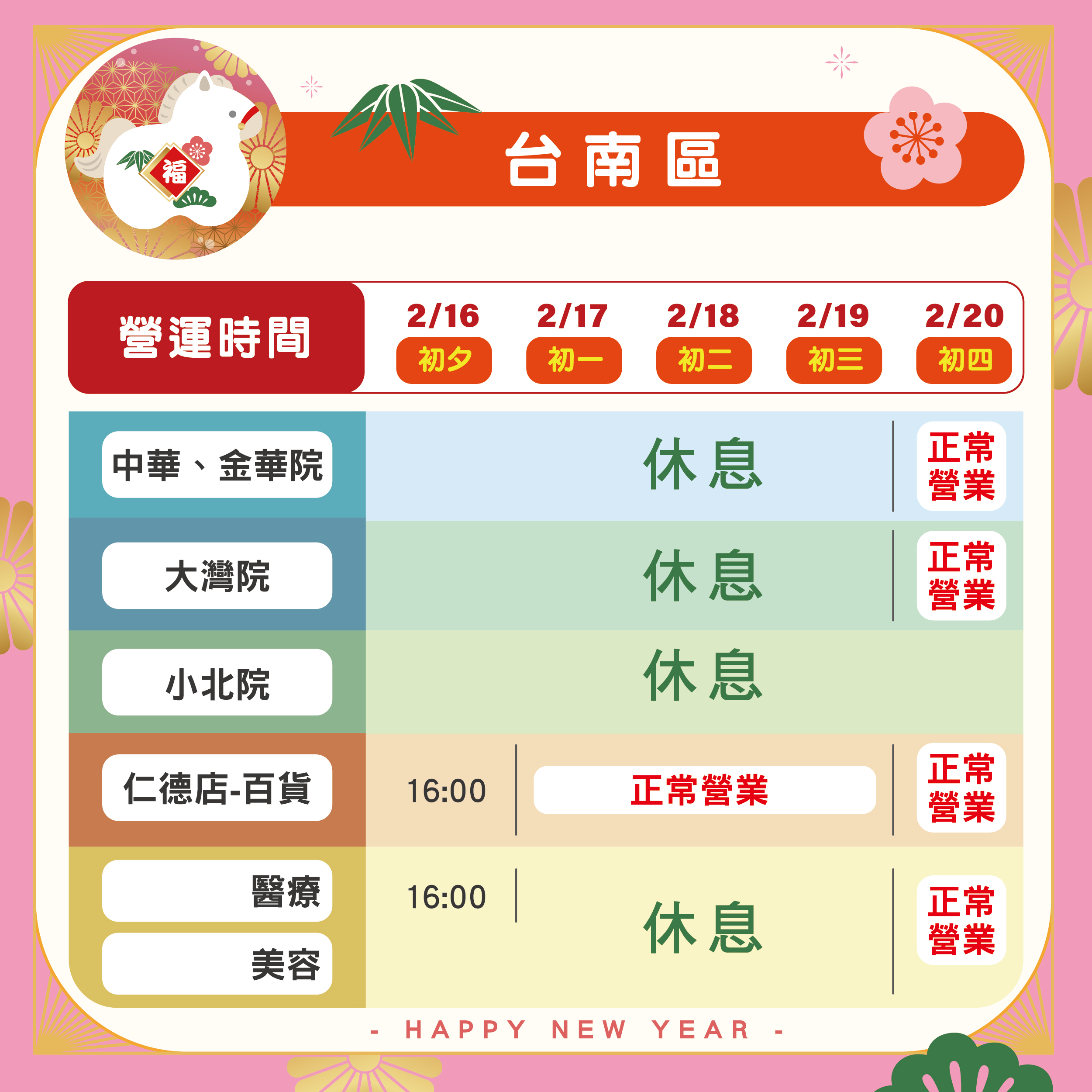 春節期間,各地分院的營業安排如下: